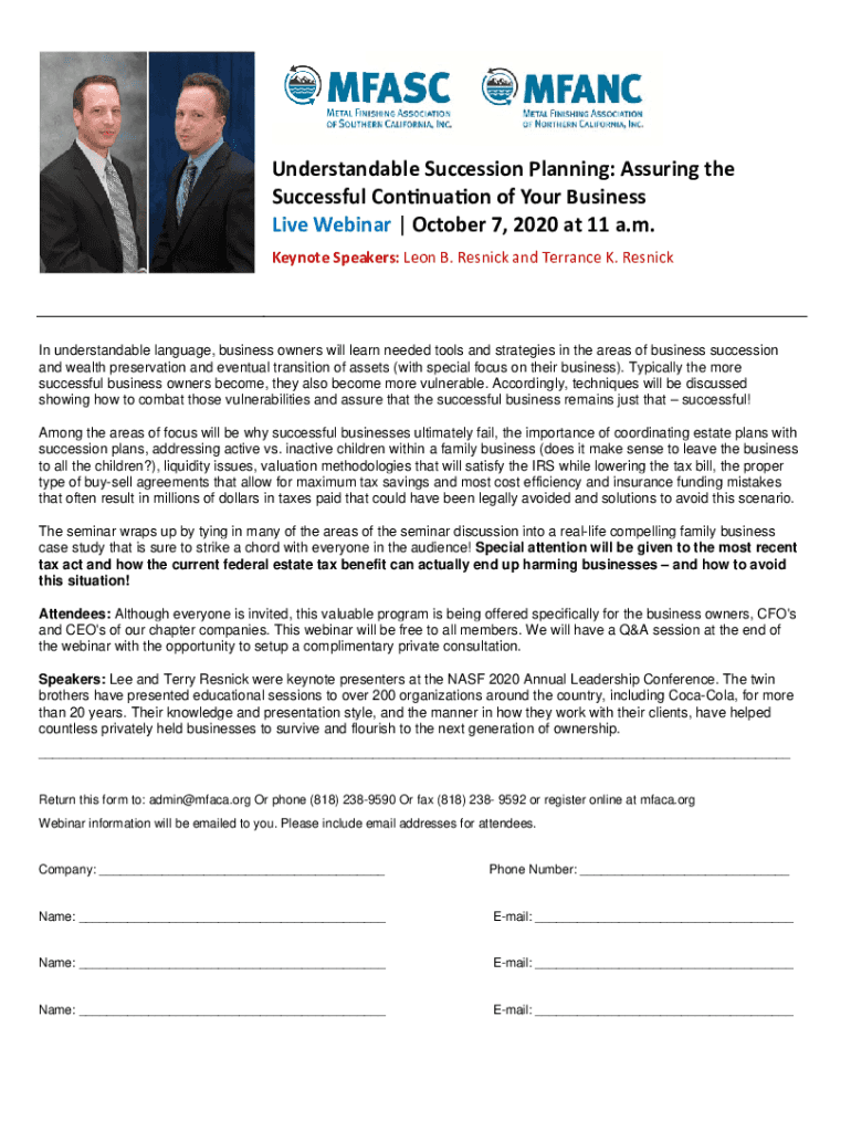 UnderstandableSuccessionPlanning:Assuringthe SuccessfulCon nua onofYourBusiness LiveWebinar|October7,2020at11a.m. KeynoteSpeakers:LeonB.ResnickandTerranceK.Resnick In understandable language, business