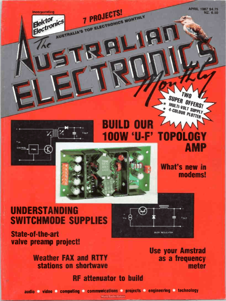 APRIL 1987 $ 4.75 NZ. 6.50ROJECTS!SeetetleS Nettle4BUILD OUR 100W ` 11F\' TOPOLOGY AMP What\'s new in modems!UNDERSTANDING SINITCHMODE SUPPLIES Stateoftheart valve preamp project! Use your Amstrad