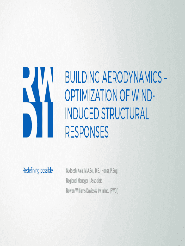 BUILDING AERODYNAMICS OPTIMIZATION OF WINDINDUCED STRUCTURAL RESPONSES Sudeesh Kala, M.A.Sc., B.E. (Hons), P.Eng. Regional Manager | Associate Rowan Williams Davies & Irwin Inc. (RWDI)RWDI Company