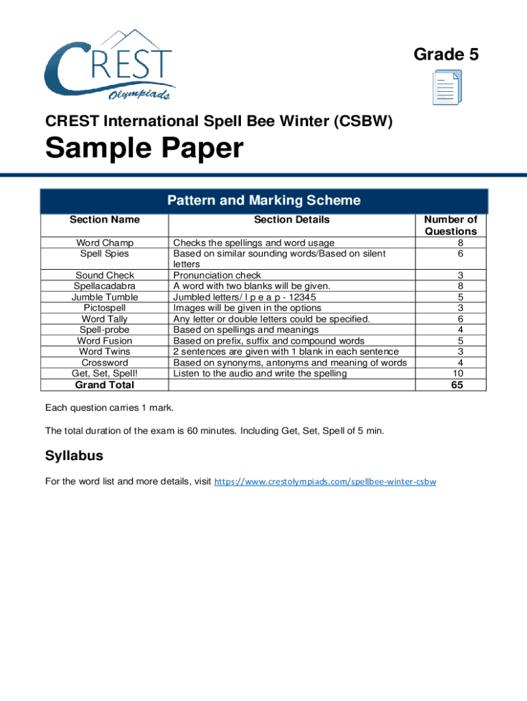 Grade 5CREST International Spell Bee Winter (CSBW)Sample Paper Pattern and Marking Scheme Section NameSection DetailsWord Champ Spell SpiesChecks the spellings and word usage Based on similar sounding