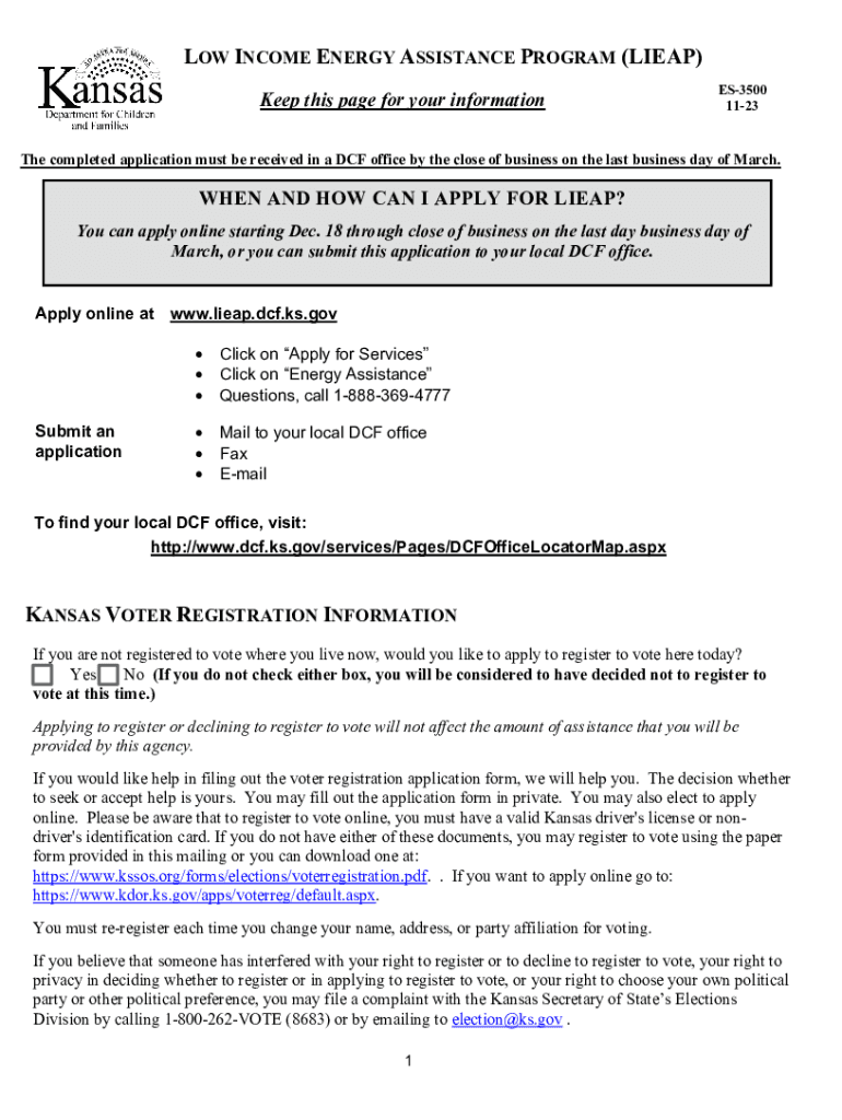 LOW INCOME ENERGY ASSISTANCE PROGRAM (LIEAP) Keep this page for your informationES3500 1123The completed application must be received in a DCF office by the close of business on the last business