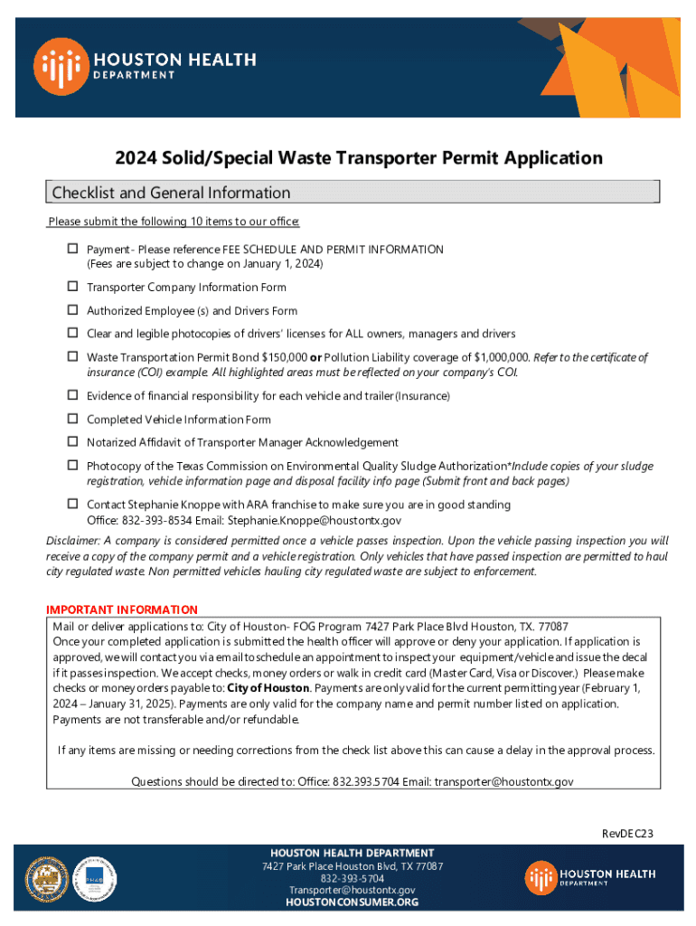 2024 Solid/Special Waste Transporter Permit Application Checklist and General Information Please submit the following 10 items to our office: Payment Please reference FEE SCHEDULE AND PERMIT INFORMATION