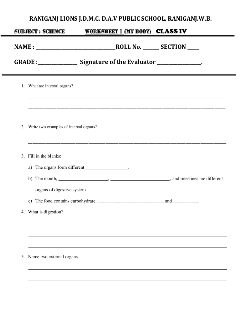 RANIGANJ LIONS J.D.M.C. D.A.V PUBLIC SCHOOL, RANIGANJ.W.B. SUBJECT : SCIENCEWorksheet 1 (MY BODY) CLASS IVNAME : ___ROLL No. ___ SECTION ___ GRADE :___ Signature of the Evaluator ___.1. What are internal