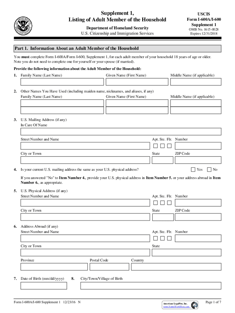 Supplement 1, Listing of Adult Member of the Household Department of Homeland Security U.S. Citizenship and Immigration ServicesUSCIS Form I600A/I600 Supplement 1 OMB No. 16150028 Expires 12/31/2018Part