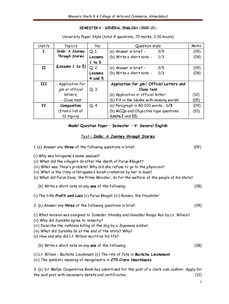 Bhavans Sheth R A College of Arts and Commerce, Ahmedabad SEMESTER V GENERAL ENGLISH (202021)University Paper Style (total 4 questions, 70 marks, 2.30 hours) Unit/s ITopic/s India: A Journey Through