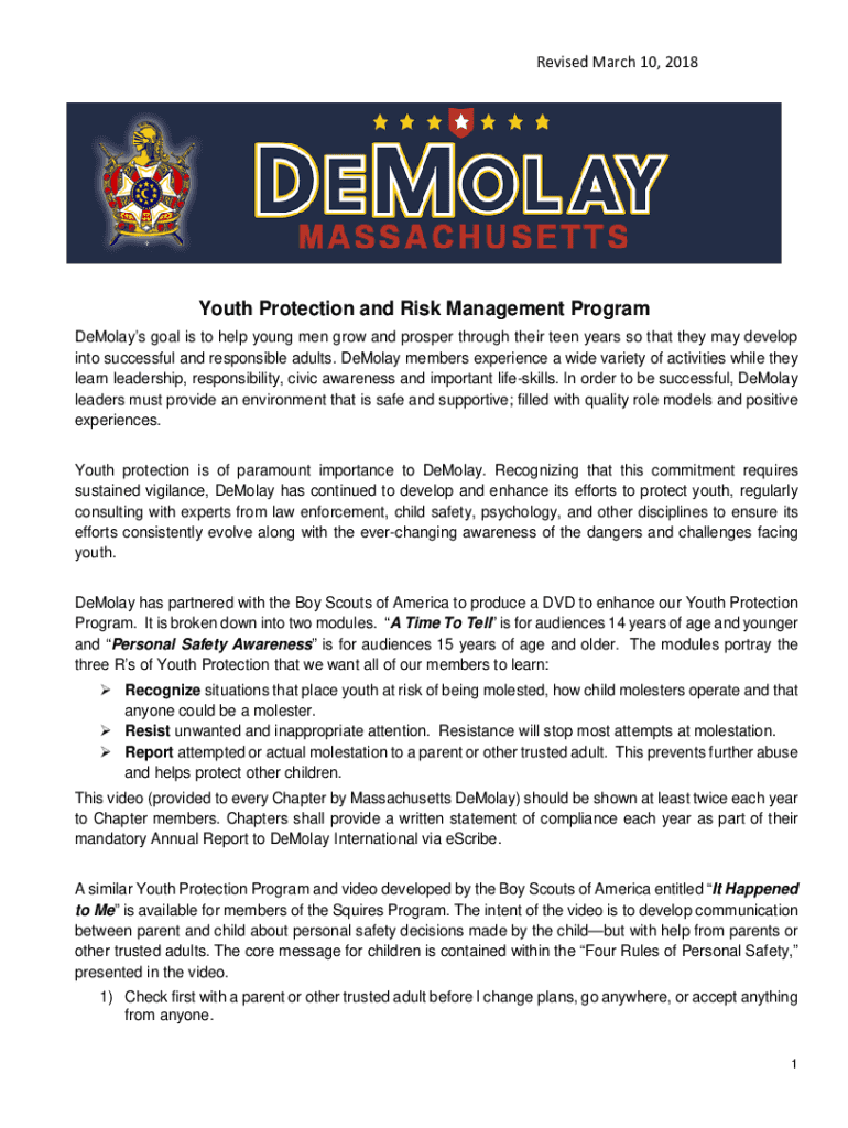 Revised March 10, 2018Youth Protection and Risk Management Program DeMolays goal is to help young men grow and prosper through their teen years so that they may develop into successful and responsible