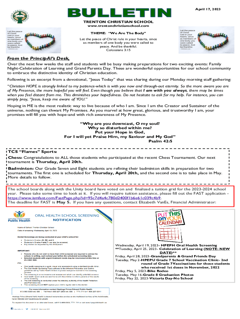 April 17, 2023TRENTON CHRISTIAN SCHOOL www.trentonchristianschool.com THEME: We Are The Body Let the peace of Christ rule in your hearts, since as members of one body you were called to peace. And