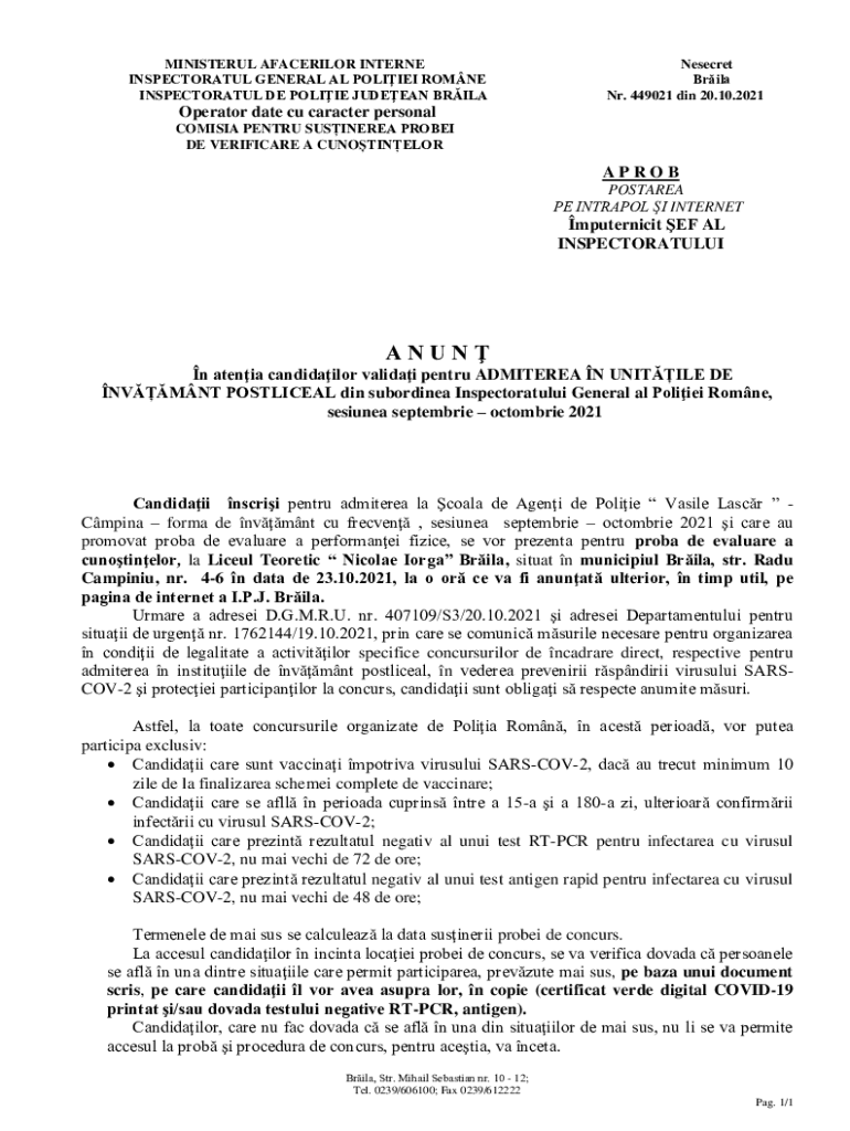 MINISTERUL AFACERILOR INTERNE INSPECTORATUL GENERAL AL POLIIEI ROMNE INSPECTORATUL DE POLIIE JUDEEAN BRILANesecret Brila Nr. 449021 din 20.10.2021Operator date cu caracter personal COMISIA PENTRU
