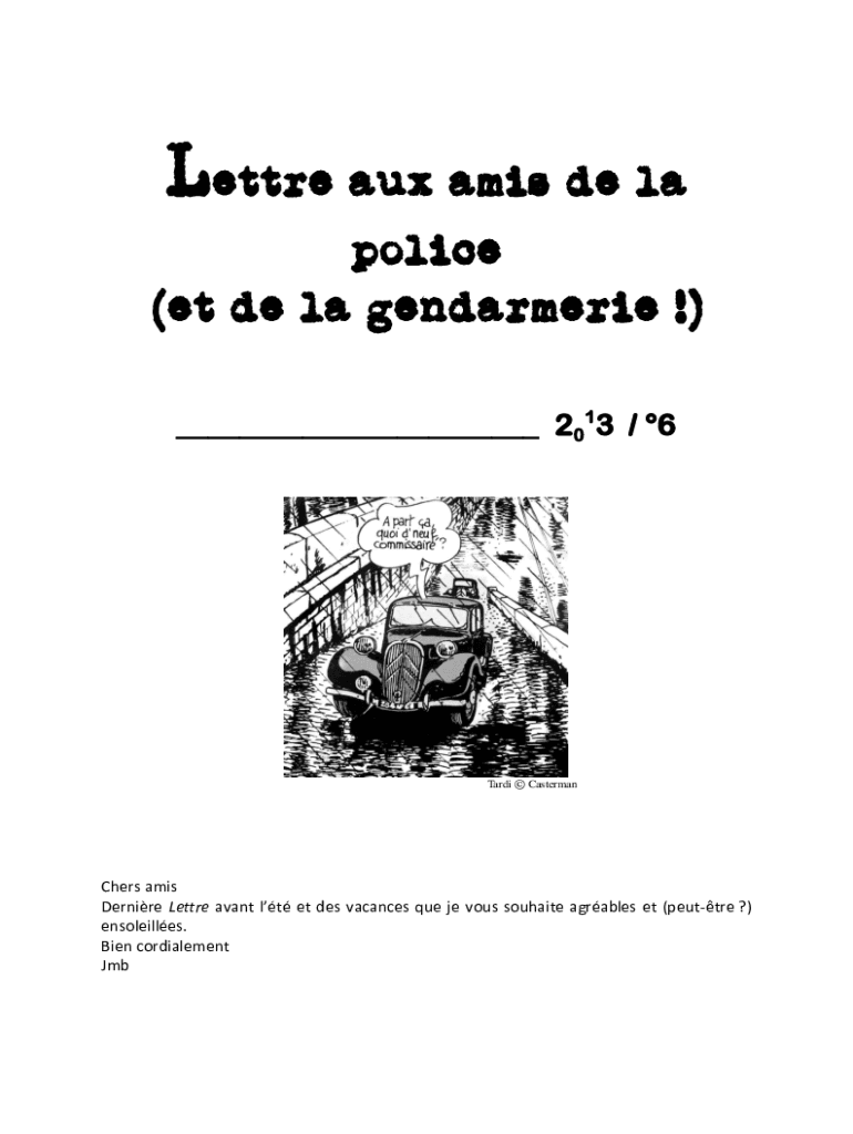 Lettre aux amis de la police (et de la gendarmerie !) ___ 2013 / 6Tardi CastermanChers amis Dernire Lettre avant lt et des vacances que je vous souhaite agrables et (peuttre ?) ensoleilles. Bien cordialement