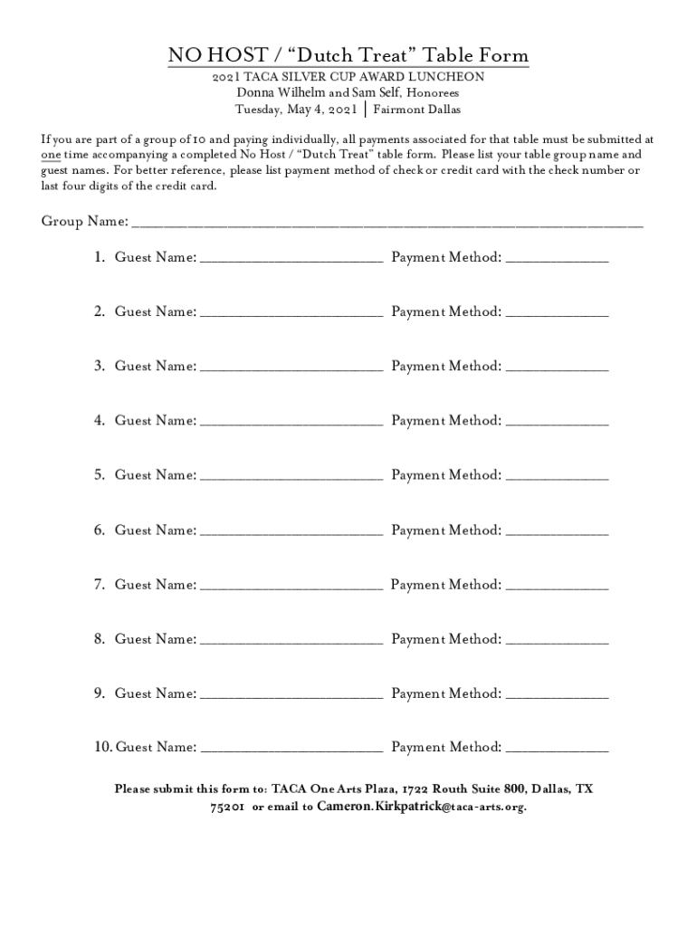 NO HOST / Dutch Treat Table Form 2021 TACA SILVER CUP AWARD LUNCHEON Donna Wilhelm and Sam Self, Honorees Tuesday, May 4, 2021 Fairmont Dallas If you are part of a group of 10 and paying individually,