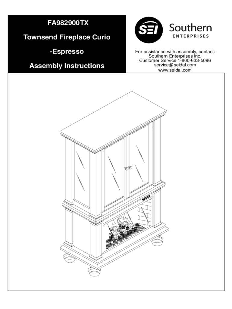 FA982900TX Townsend Fireplace Curio Espresso Assembly InstructionsFor assistance with assembly, contact: Southern Enterprises Inc. Customer Service 18006335096 service@seidal.com www.seidal.comTownsend