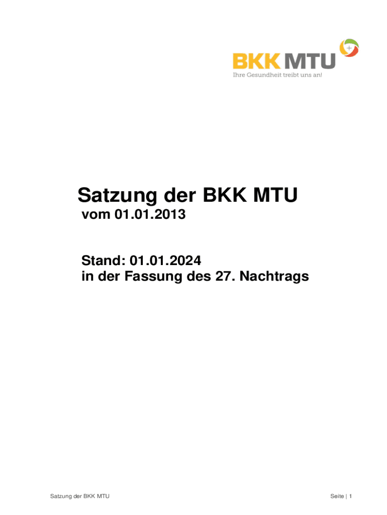 Satzung der BKK MTU vom 01.01.2013Stand: 01.01.2024 in der Fassung des 27. NachtragsSatzung der BKK MTUSeite | 1bersicht zur Satzung Artikel I Inhalt der Satzung 1 2 2a 3 4 5 6 7 8 9 9a 9b 10 11 12