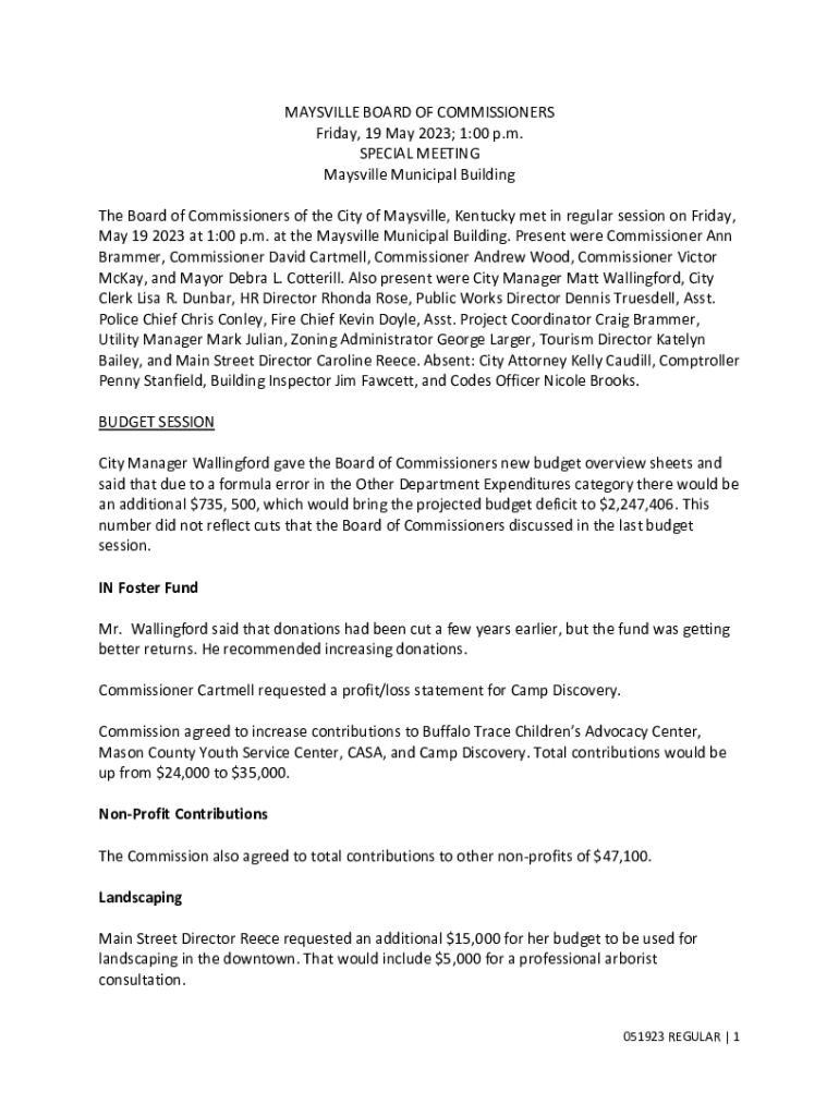 MAYSVILLE BOARD OF COMMISSIONERS Friday, 19 May 2023; 1:00 p.m. SPECIAL MEETING Maysville Municipal Building The Board of Commissioners of the City of Maysville, Kentucky met in regular session on