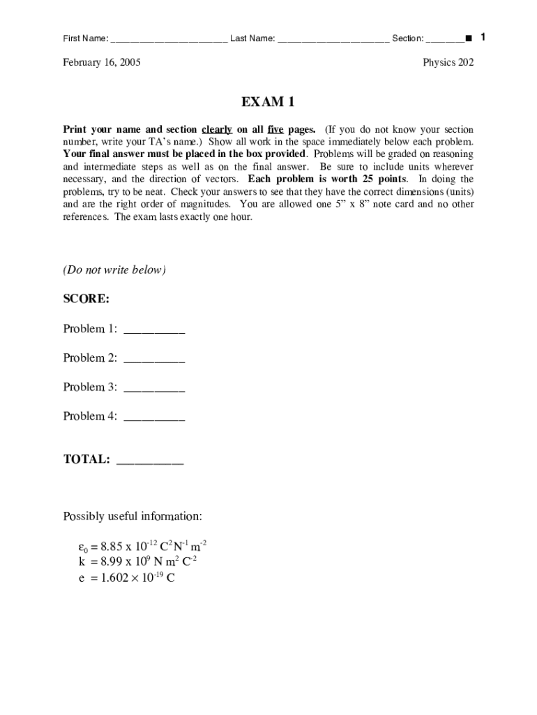 First Name: ___ Last Name: ___ Section: ___February 16, 2005Physics 202EXAM 1 Print your name and section clearly on all five pages. (If you do not know your section number, write your TAs name.)