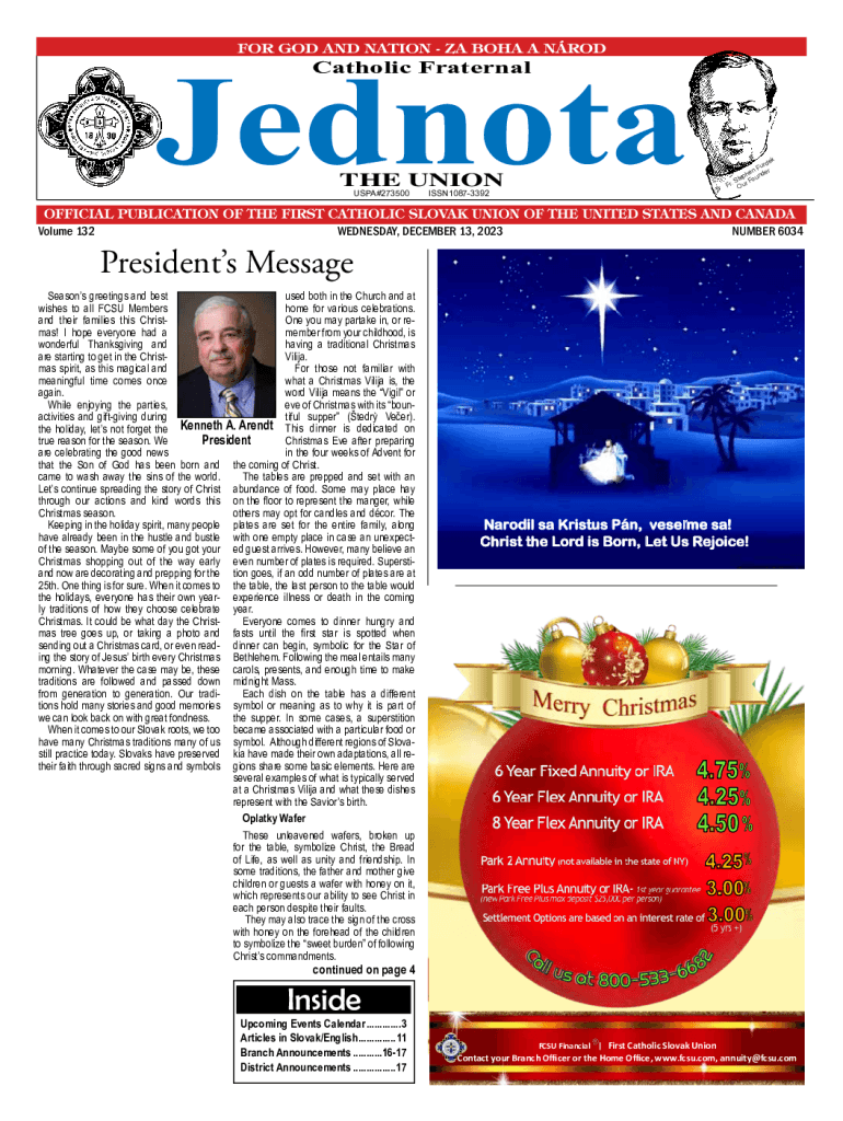 Jednota Catholic FraternalTHE UNION USPA#273500Volume 132ISSN10873392WEDNESDAY, DECEMBER 13, 2023ke urd nF r he unde p Ste Fo Fr. OurNUMBER 6034Presidents Message Seasons greetings and best used both