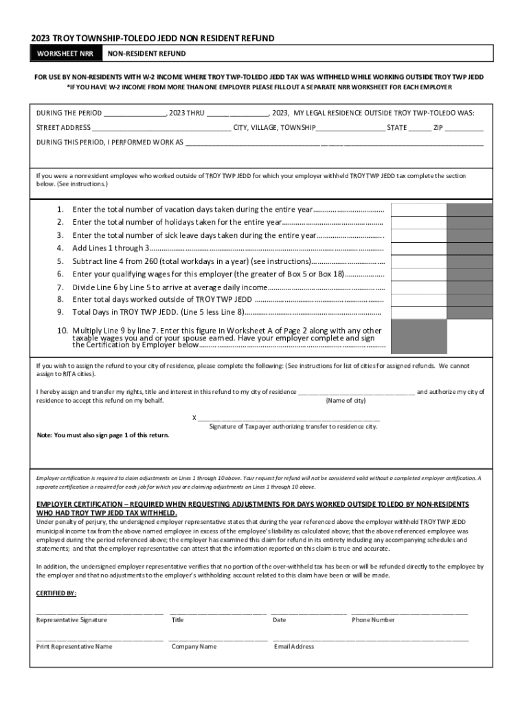 2023 TROY TOWNSHIPTOLEDO JEDD NON RESIDENT REFUND WORKSHEET NRRNONRESIDENT REFUNDFOR USE BY NONRESIDENTS WITH W2 INCOME WHERE TROY TWPTOLEDO JEDD TAX WAS WITHHELD WHILE WORKING OUTSIDE TROY TWP JEDD