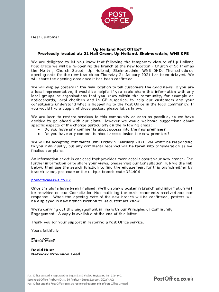 Dear Customer Up Holland Post Office Previously located at: 21 Hall Green, Up Holland, Skelmersdale, WN8 0PB We are delighted to let you know that following the temporary closure of Up Holland Post