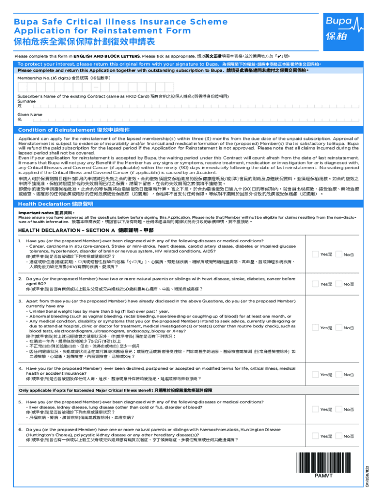 Get the free Bupa Safe Critical Illness Insurance Scheme Application for Reinstatement Form