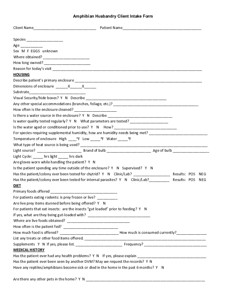 To fill out amphibian husbandry client intake, clients must gather information regarding their amphibian species, care practices, breeding programs, and habitat conditions, and complete the provided intake form accurately.