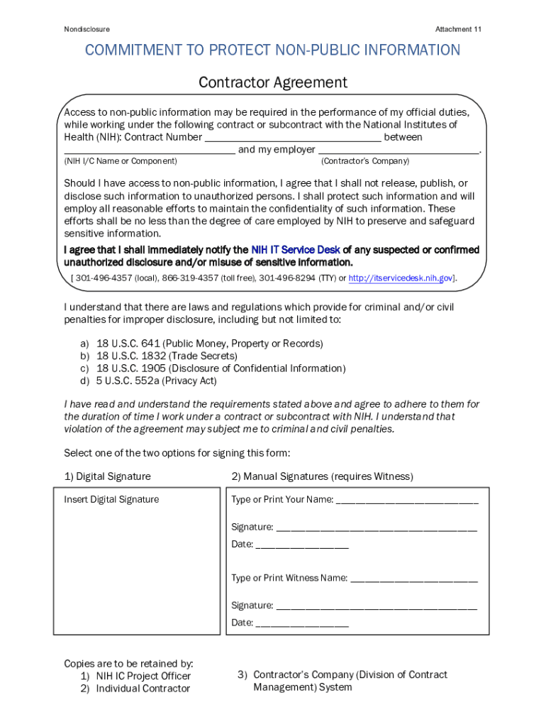 NondisclosureAttachment 11CONTRACTOR NONDISCLOSURE AGREEMENT (NDA)Each contractor/subcontractor who may have access to nonpublic information under their contract must sign the form: Commitment to