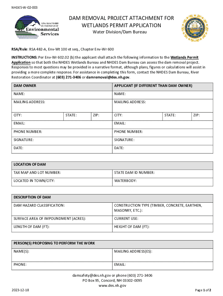 NHDESW02003DAM REMOVAL PROJECT ATTACHMENT FOR WETLANDS PERMIT APPLICATION Water Division/Dam BureauRSA/Rule: RSA 482A, EnvWt 100 et seq., Chapter EnvWr 600 INSTRUCTIONS: Per EnvWr 602.02 (b) the applicant