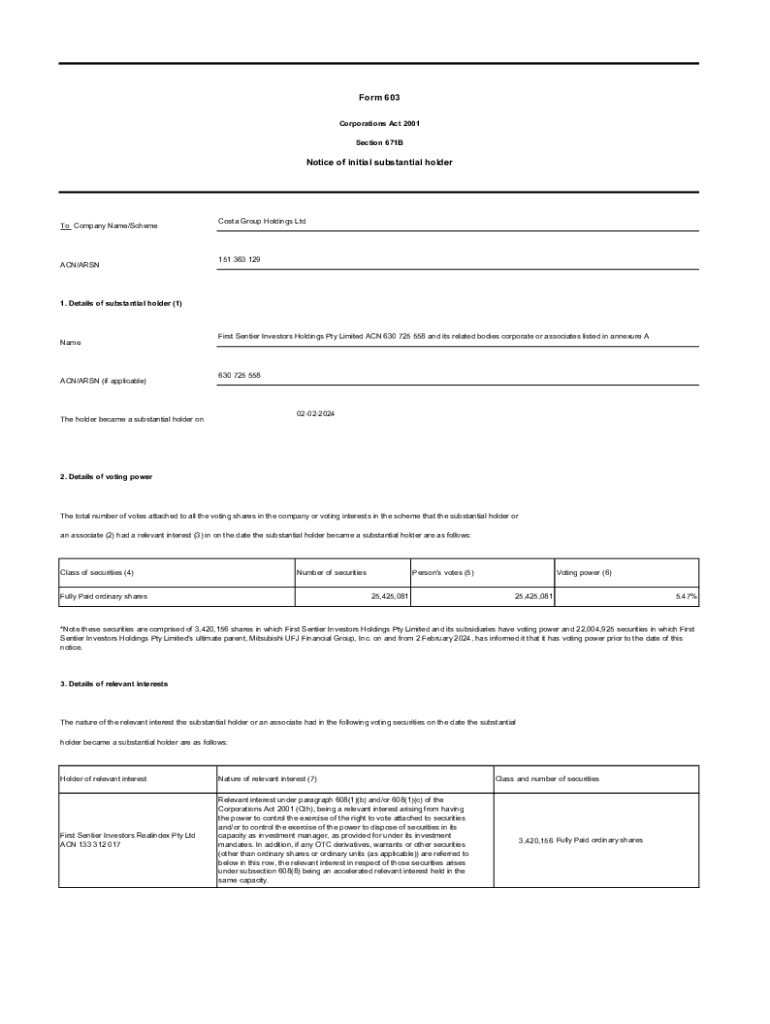 Get the free Notice of initial substantial holder Form 603 - Costa Group