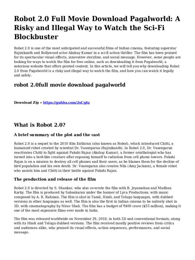 Robot 2.0 Full Movie Download Pagalworld: A Risky and Illegal Way to Watch the SciFi Blockbuster Robot 2.0 is one of the most anticipated and successful films of Indian cinema, featuring superstar