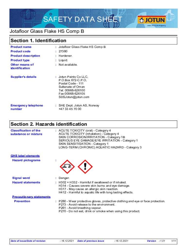 SAFETY DATA SHEET Jotafloor Glass Flake HS Comp B Section 1. Identification Product name: Jotafloor Glass Flake HS Comp BProduct code: 27380Product description: Hardener.Product type: Liquid.Other
