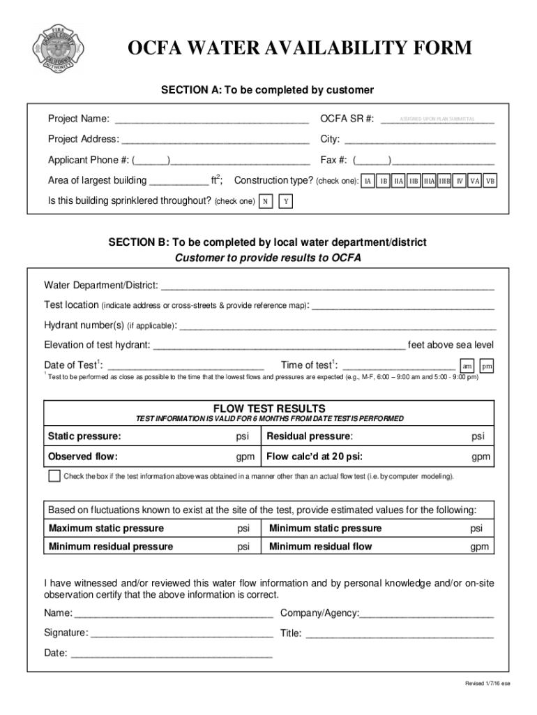 OCFA WATER AVAILABILITY FORM SECTION A: To be completed by customer Project Name: ___ASSIGNED UPON PLAN SUBMITTAL OCFA SR #: ___Project Address: ___City: ___Applicant Phone #: (___)___Fax #: (___)
