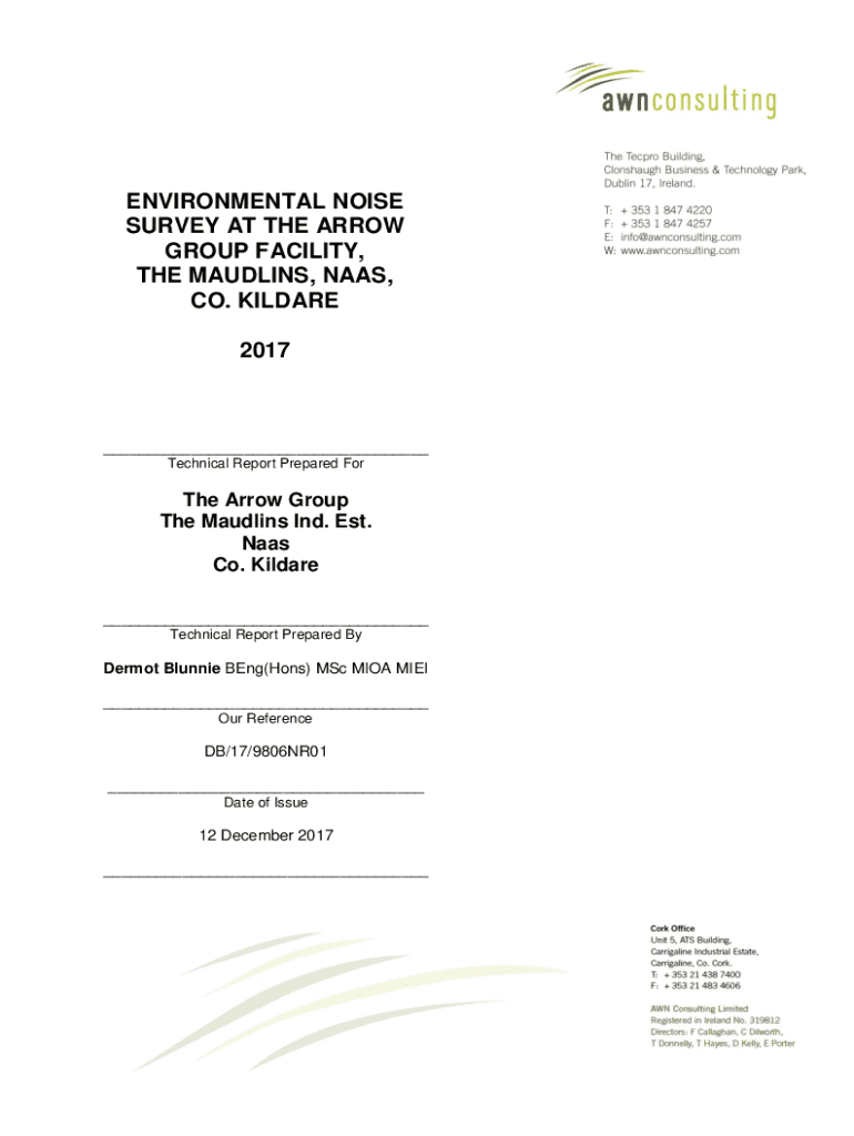 ENVIRONMENTAL NOISE SURVEY AT THE ARROW GROUP FACILITY, THE MAUDLINS, NAAS, CO. KILDARE 2017___ Technical Report Prepared ForThe Arrow Group The Maudlins Ind. Est. Naas Co. Kildare ___ Technical Report