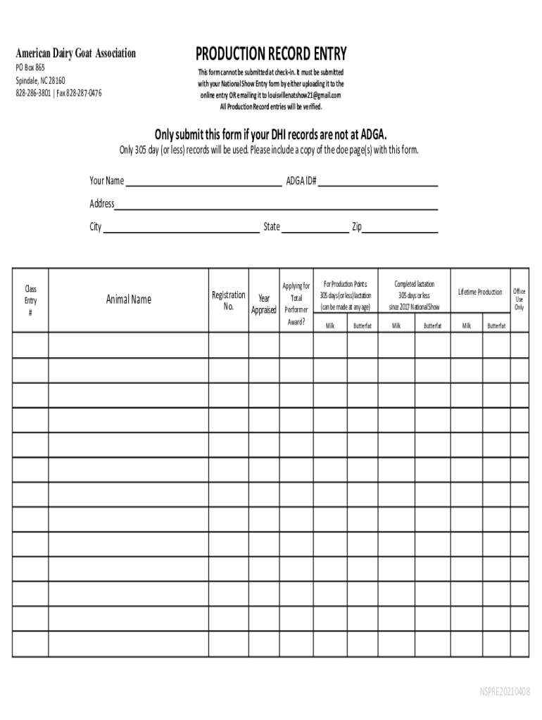 American Dairy Goat Association PO Box 865 Spindale, NC 28160 8282863801 | Fax 8282870476PRODUCTION RECORD ENTRY This form cannot be submitted at checkin. It must be submitted with your National Show
