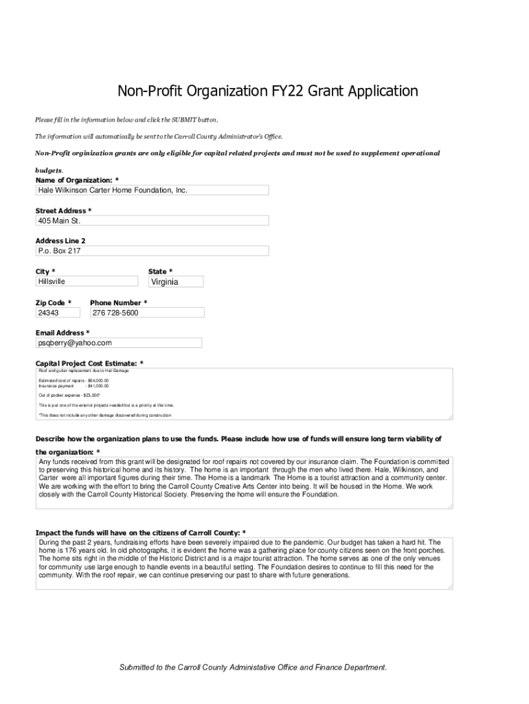 Nonprofit Organization FY22 Grant ApplicationName of Organization:*Hale Wilkinson Carter Home Foundation, Inc.