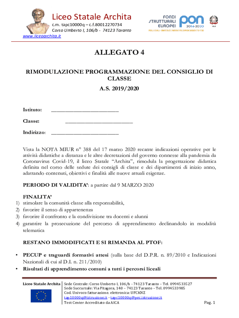 Liceo Statale Archita c.m. tapc10000q c.f.80012270734 Corso Umberto I, 106/b 74123 Taranto www.liceoarchita.itALLEGATO 4 RIMODULAZIONE PROGRAMMAZIONE DEL CONSIGLIO DI CLASSE A.S. 2019/2020 Istituto: