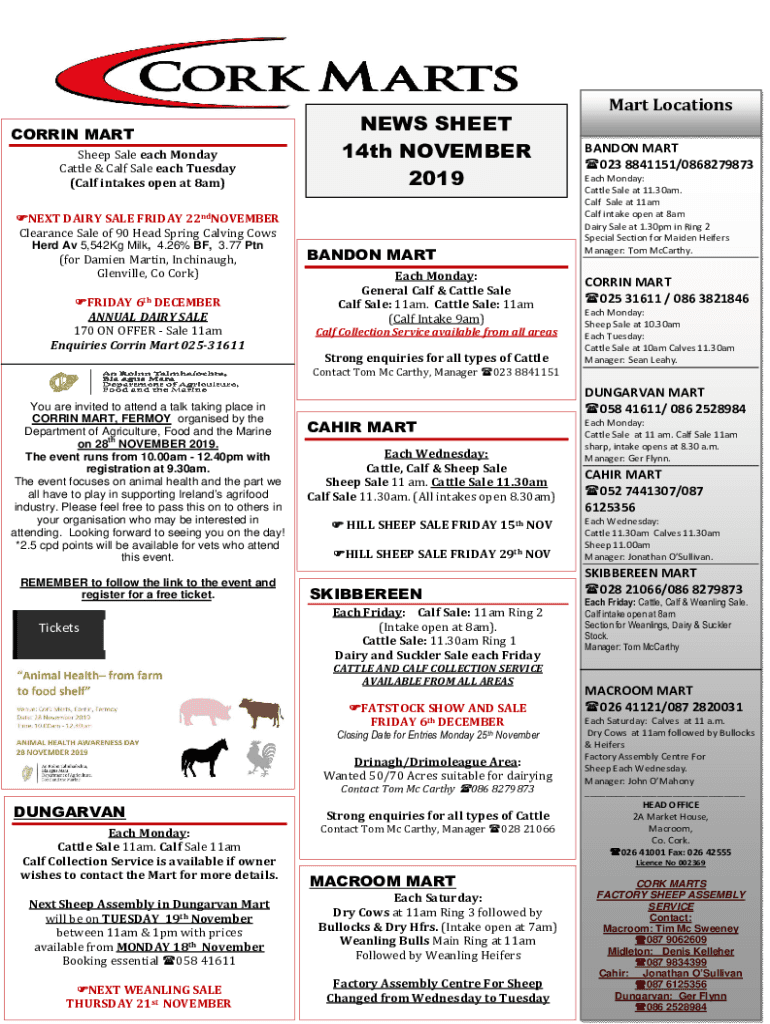 Mart Locations CORRIN MART Sheep Sale each Monday Cattle & Calf Sale each Tuesday (Calf intakes open at 8am)NEWS SHEET 14th NOVEMBER 2019NEXT DAIRY SALE FRIDAY 22ndNOVEMBER Clearance Sale of 90 Head