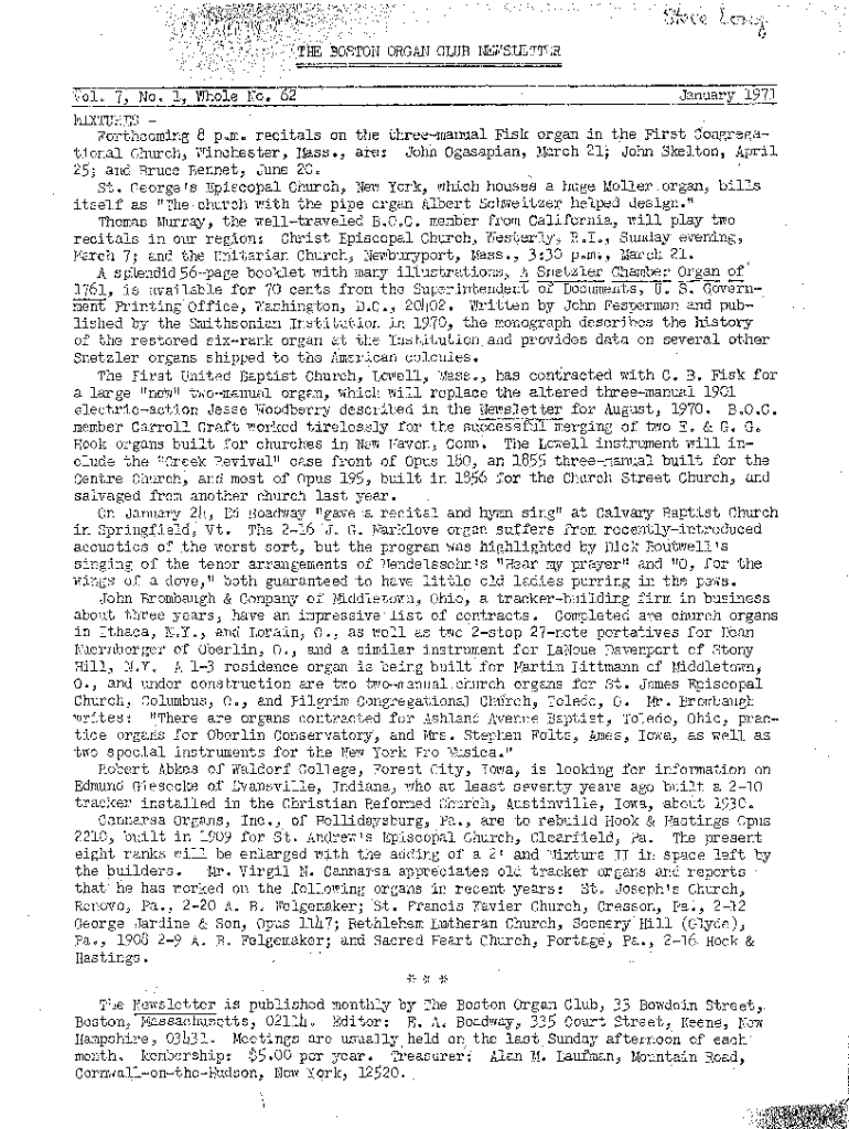Vol. 7) No. 1, Whole No. 62January 1971MIXTURES Forthcoming 8 p.m. recitals on the three manual Fisk organ in the First Congregational Church, Winchester, Mass.,