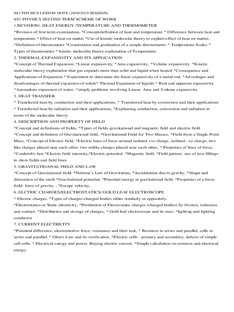 SS1 PHYSICS LESSON NOTE (2018/2019 SESSION)SS1 PHYSICS SECOND TERM SCHEME OF WORK 1 REVISION/. HEAT ENERGY /TEMPERATURE AND THERMOMETER *Revision of first term examination, *Concept/definition of