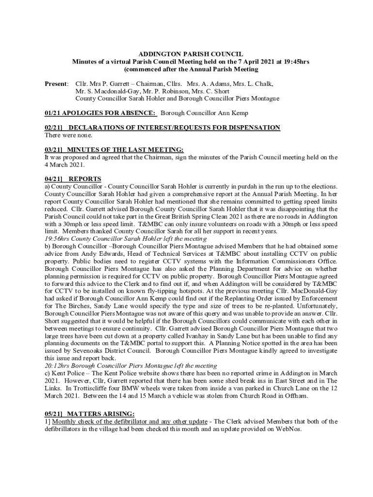 ADDINGTON PARISH COUNCIL Minutes of a virtual Parish Council Meeting held on the 7 April 2021 at 19:45hrs (commenced after the Annual Parish Meeting Present: Cllr. Mrs P. Garrett Chairman, Cllrs.