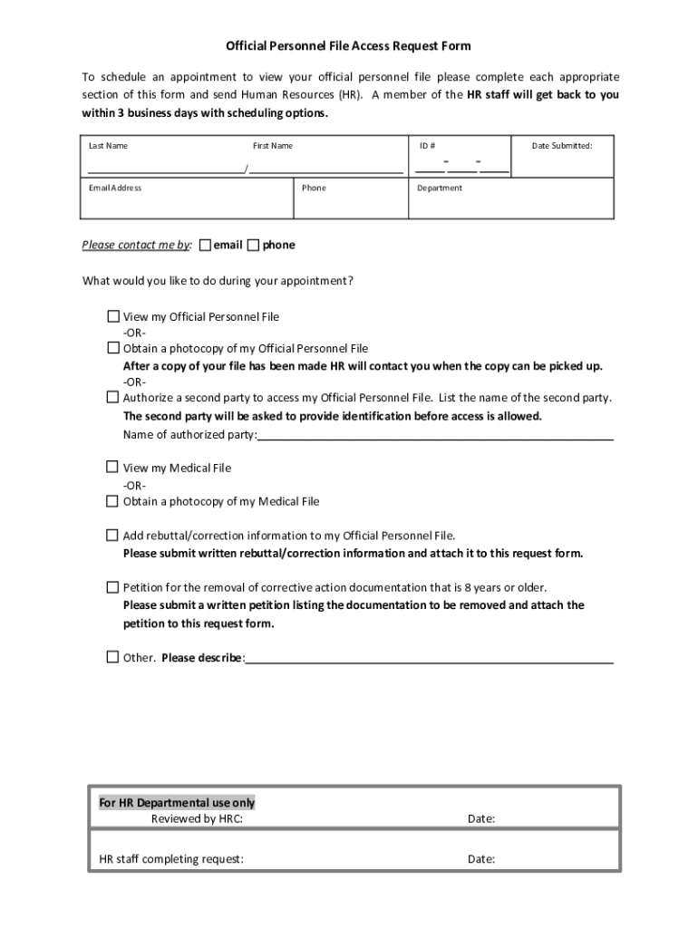 Official Personnel File Access Request Form To schedule an appointment to view your official personnel file please complete each appropriate section of this form and send Human Resources (HR). A member