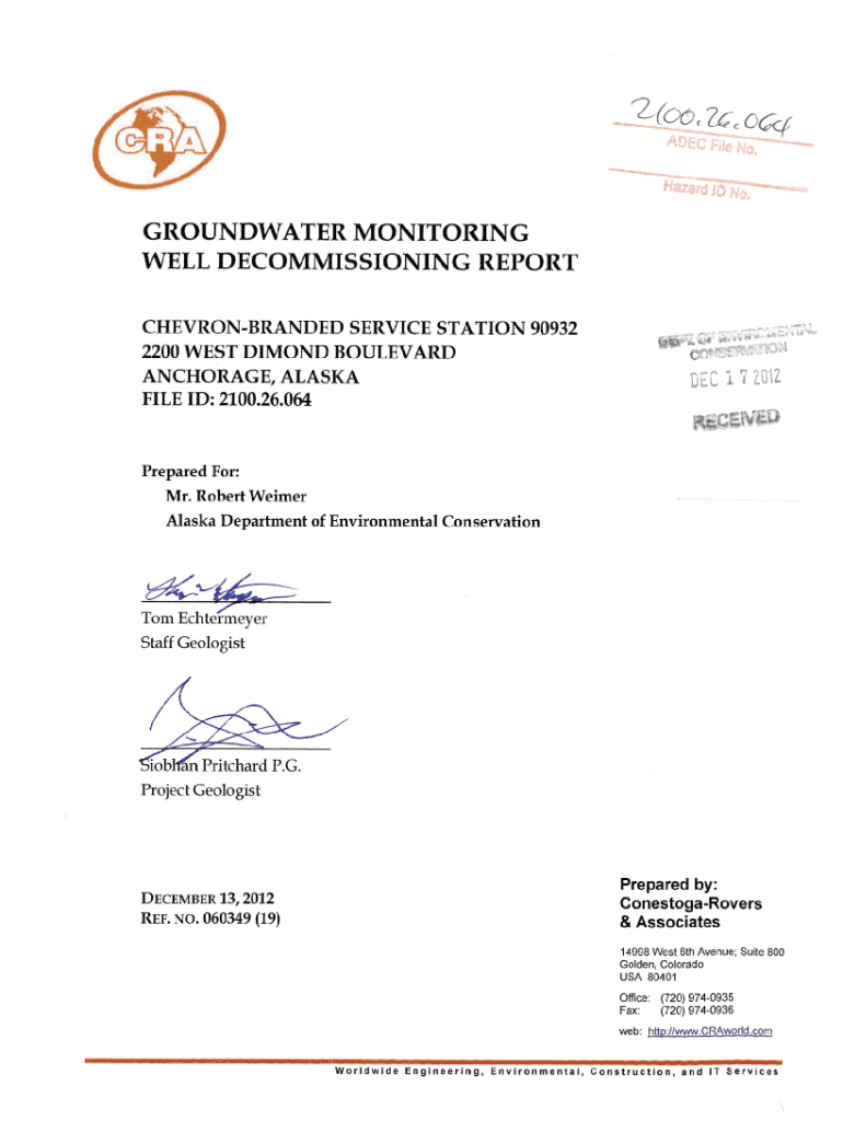 GROUNDWATER MONITORING WELL DECOMMISSIONING REPORT CHEVRONBRANDEDSERVICE STATION 909322200 WEST DIMOND BOULEVARD ANCHORAGE, ALASKA FILE ID: 2100.26.064Be Cones DEC i 7 2012anRECEVEV Prepared For:Mr.