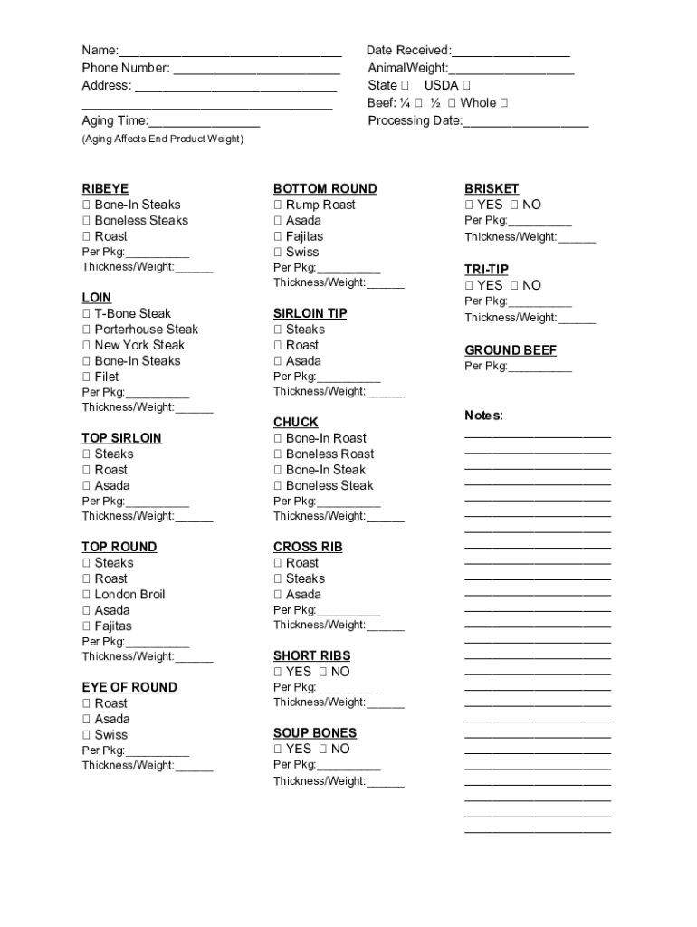 Name:___ Phone Number: ___ Address: ___ ___ Aging Time:___Date Received:___ AnimalWeight:___ State USDA Beef: Whole Processing Date:___(Aging Affects End Product Weight)RIBEYE BoneIn Steaks Boneless