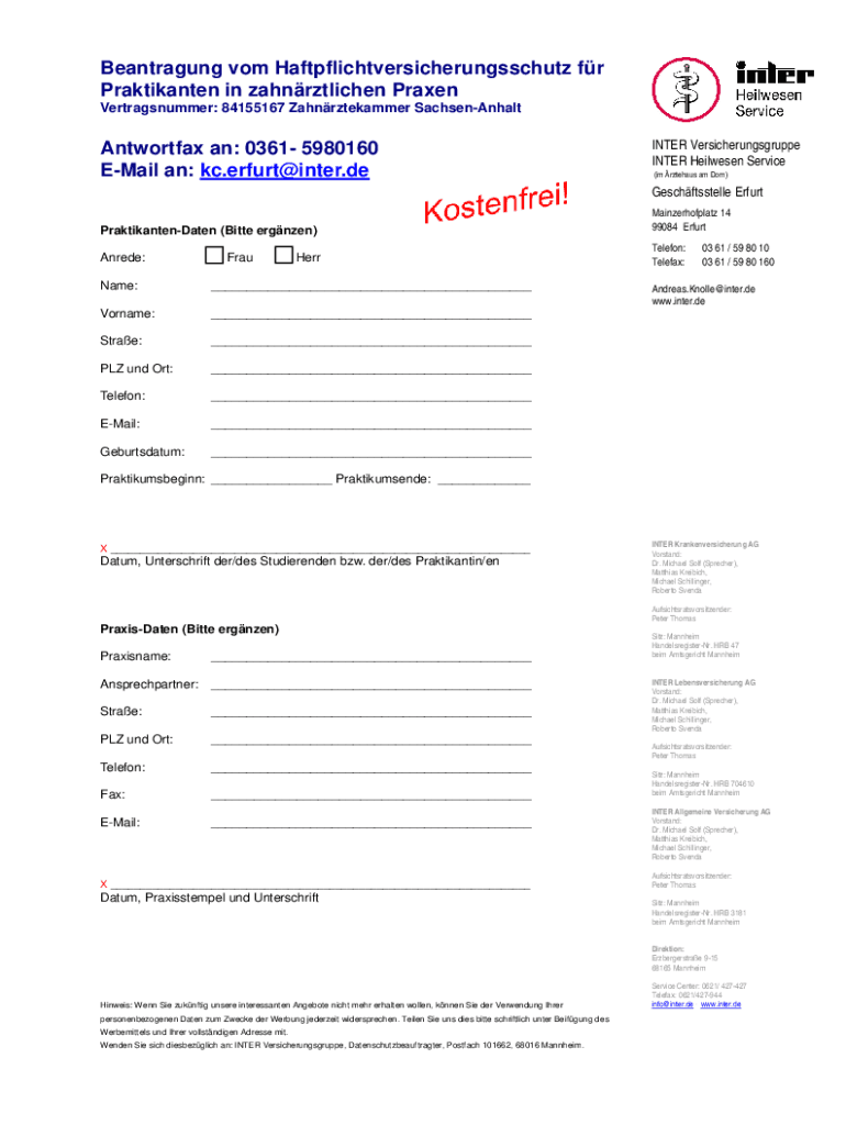 Beantragung vom Haftpflichtversicherungsschutz fr Praktikanten in zahnrztlichen Praxen Vertragsnummer: 84155167 Zahnrztekammer SachsenAnhaltAntwortfax an: 0361 5980160 EMail an: kc.erfurt@inter.deINTER