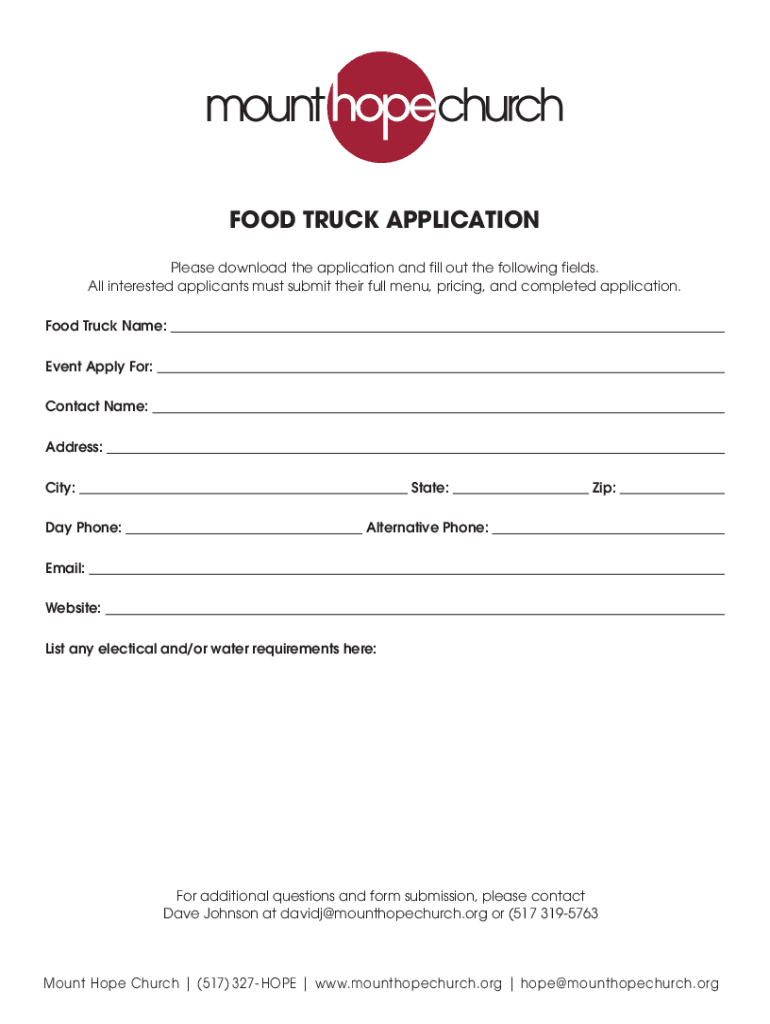 FOOD TRUCK APPLICATION Please download the application and fill out the following fields. All interested applicants must submit their full menu, pricing, and completed application. Food Truck Name:Event