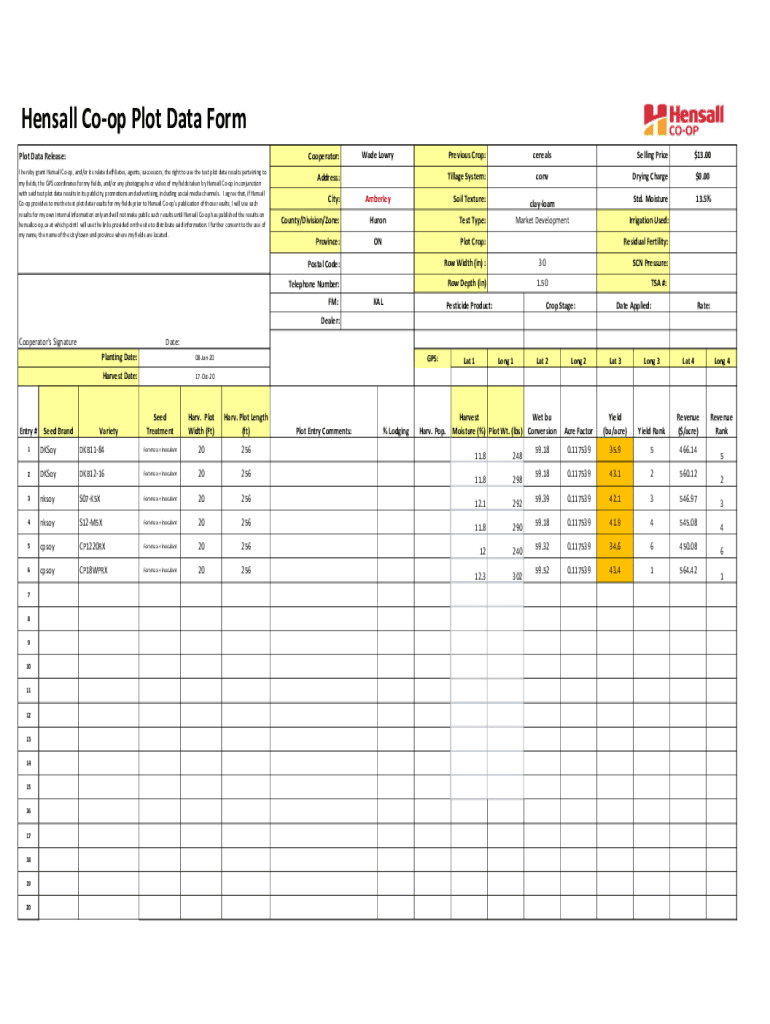 Hensall Coop Plot Data Form Plot Data Release:Cooperator:I hereby grant Hensall Coop, and/or its related affiliates, agents, successors, the right to use the test plot data results pertaining to my