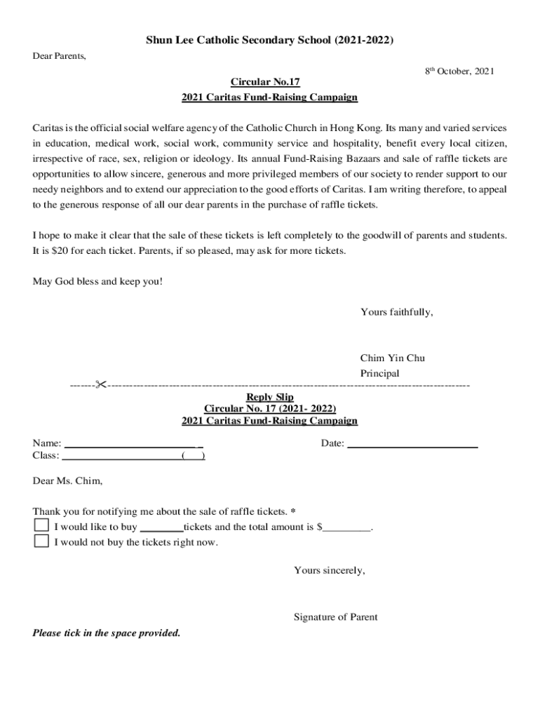 Shun Lee Catholic Secondary School (20212022) Dear Parents, 8th October, 2021Circular No.17 2021 Caritas FundRaising Campaign Caritas is the official social welfare agency of the Catholic Church in