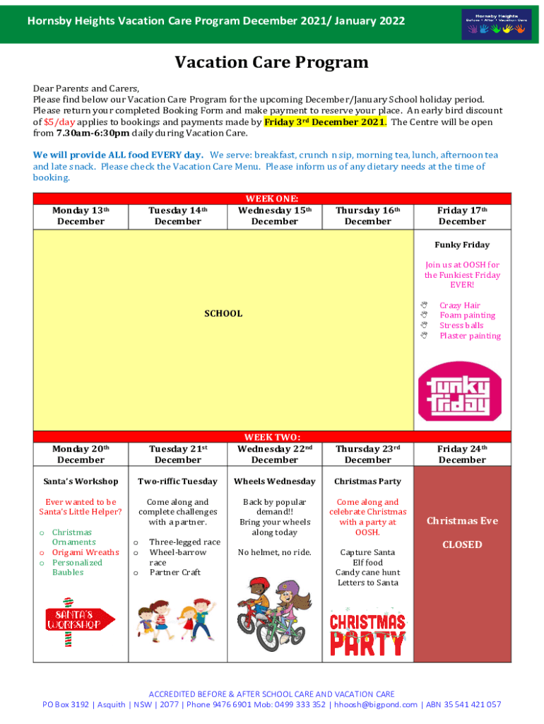 Hornsby Heights Vacation Care Program December 2021/ January 2022Vacation Care Program Dear Parents and Carers, Please find below our Vacation Care Program for the upcoming December/January School