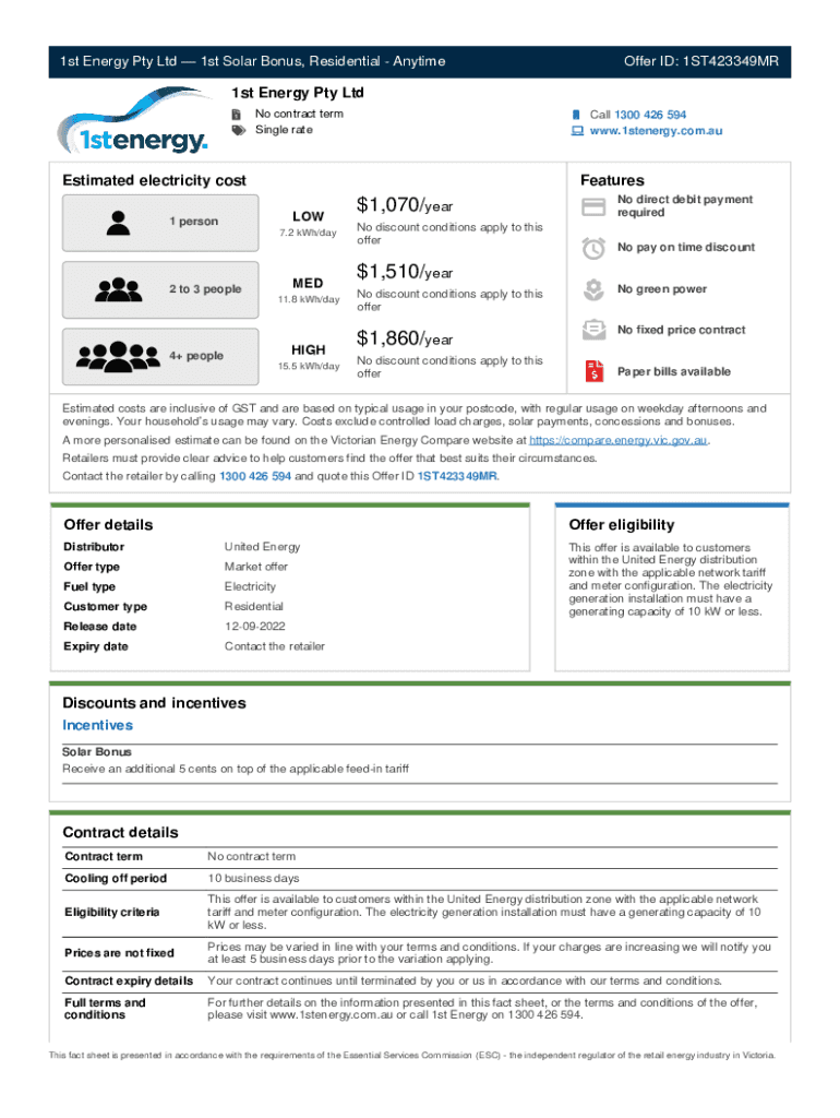 1st Energy Pty Ltd 1st Solar Bonus, Residential AnytimeOffer ID: 1ST423349MR1st Energy Pty Ltd No contract term Single rateCall 1300 426 594 www.1stenergy.com.auEstimated electricity costFeatures