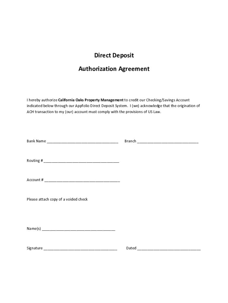Direct Deposit Authorization AgreementI hereby authorize California Oaks Property Management to credit our Checking/Savings Account indicated below through our Appfolio Direct Deposit System. I (we)