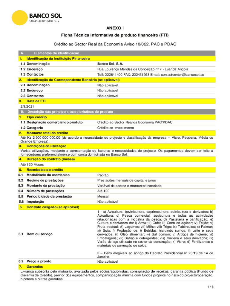 ANEXO I Ficha Tcnica Informativa de produto financeiro (FTI) Crdito ao Sector Real da Economia Aviso 10/022, PAC e PDAC A. 1.Elementos de identificao Identificao da Instituio Financeira1.1 DenominaoBanco