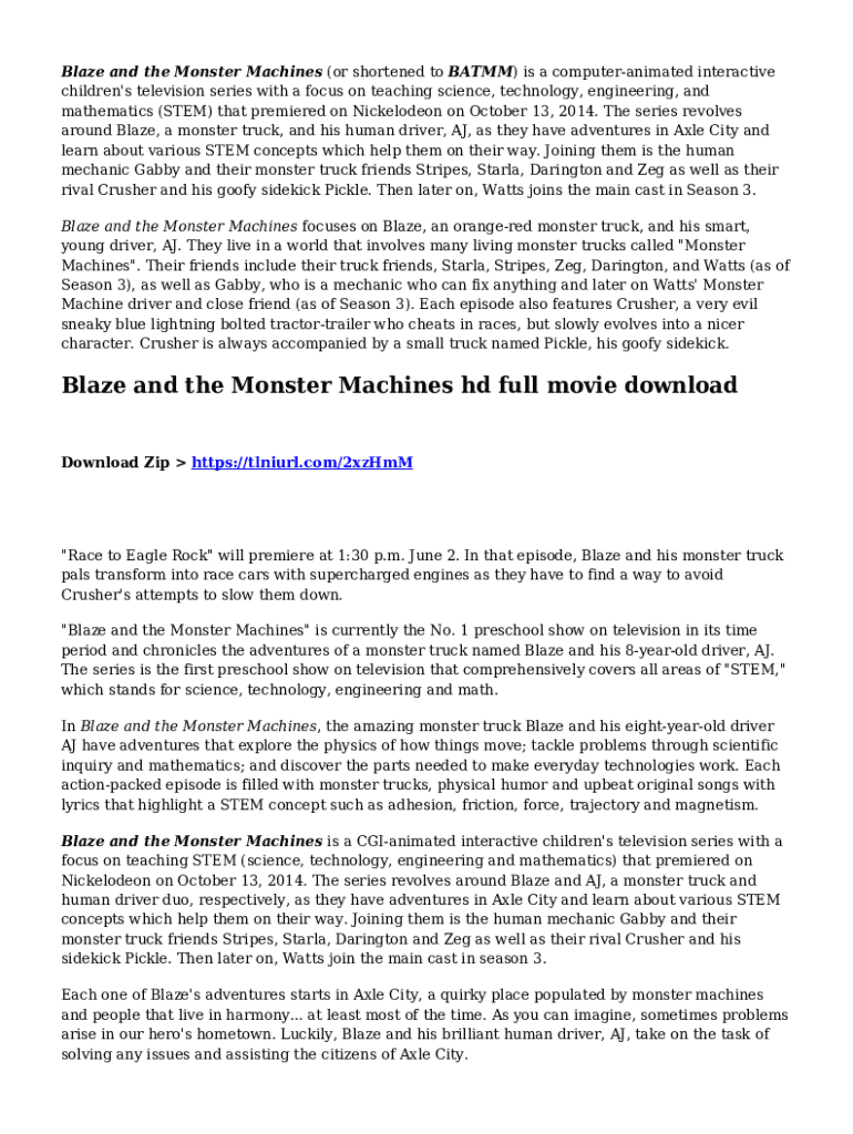 Blaze and the Monster Machines (or shortened to BATMM) is a computeranimated interactive children\'s television series with a focus on teaching science, technology, engineering, and mathematics (STEM)