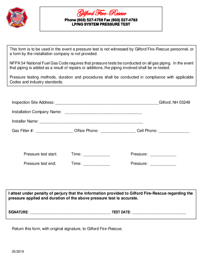 LP/NG SYSTEM PRESSURE Testis form is to be used in the event a pressure test is not witnessed by Milford FireRescue personnel, or